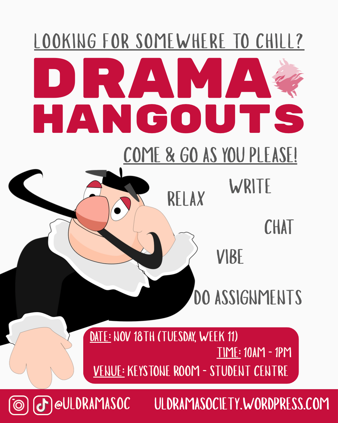 University is a busy place, and sometimes it can be hard to find a place to unwind. UL Drama Society is here to help with that. Join us Tuesdays in the Keystone Room in the New Student Centre from 10am to 1pm!