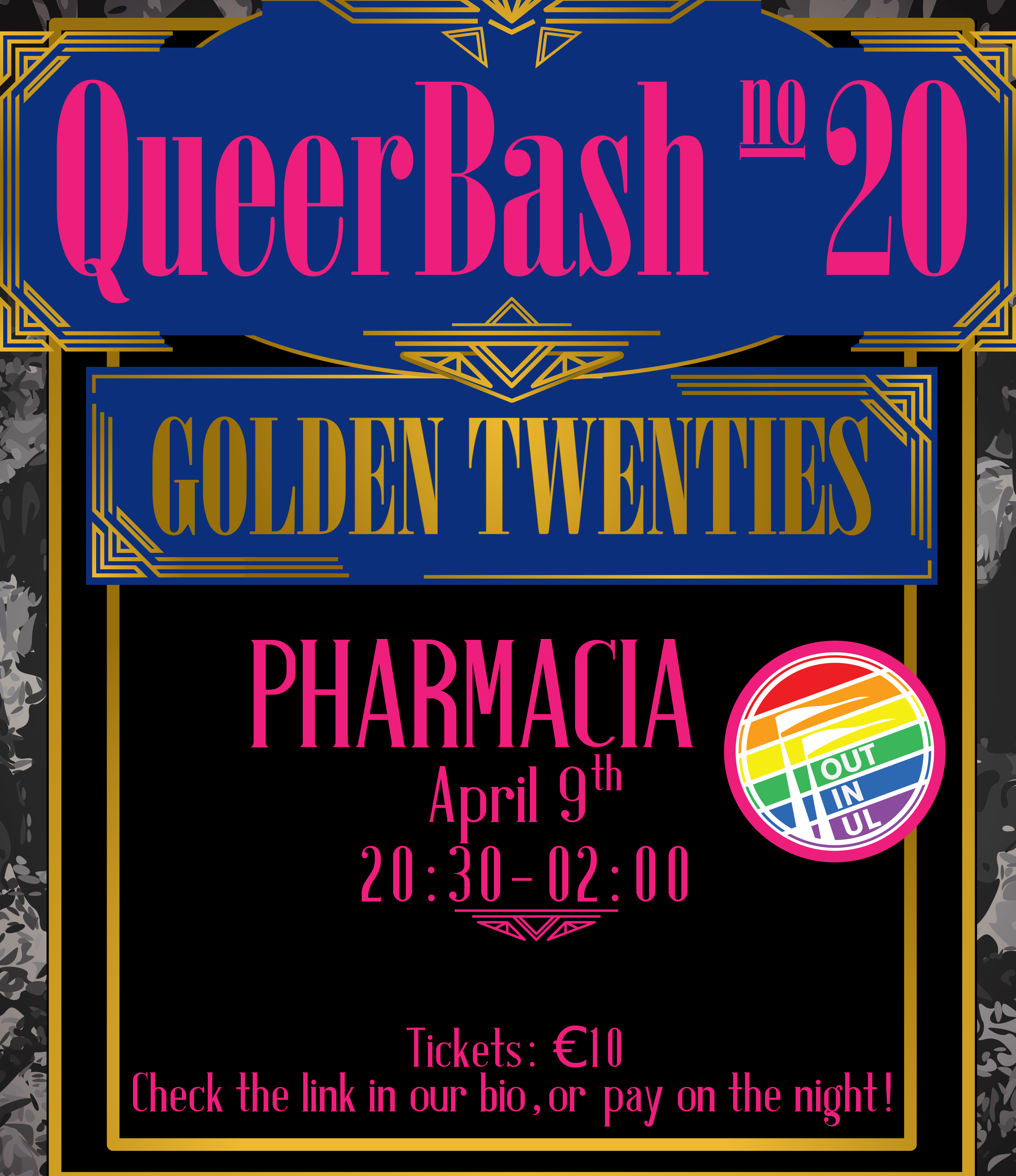 We are happy to announce that tickets for Queerbash are now available! Queerbash is our biggest event of this semester filled with music, dance, drag performances and more. It will take place on April 9th in Pharmacia and this year's theme is the Golden Twenties. Tickets are available through the link below, through our linktree on Instagram and will be available at the door on the night. Queerbash is all inclusive for both Out in UL members and non-members, so bring your friends along.