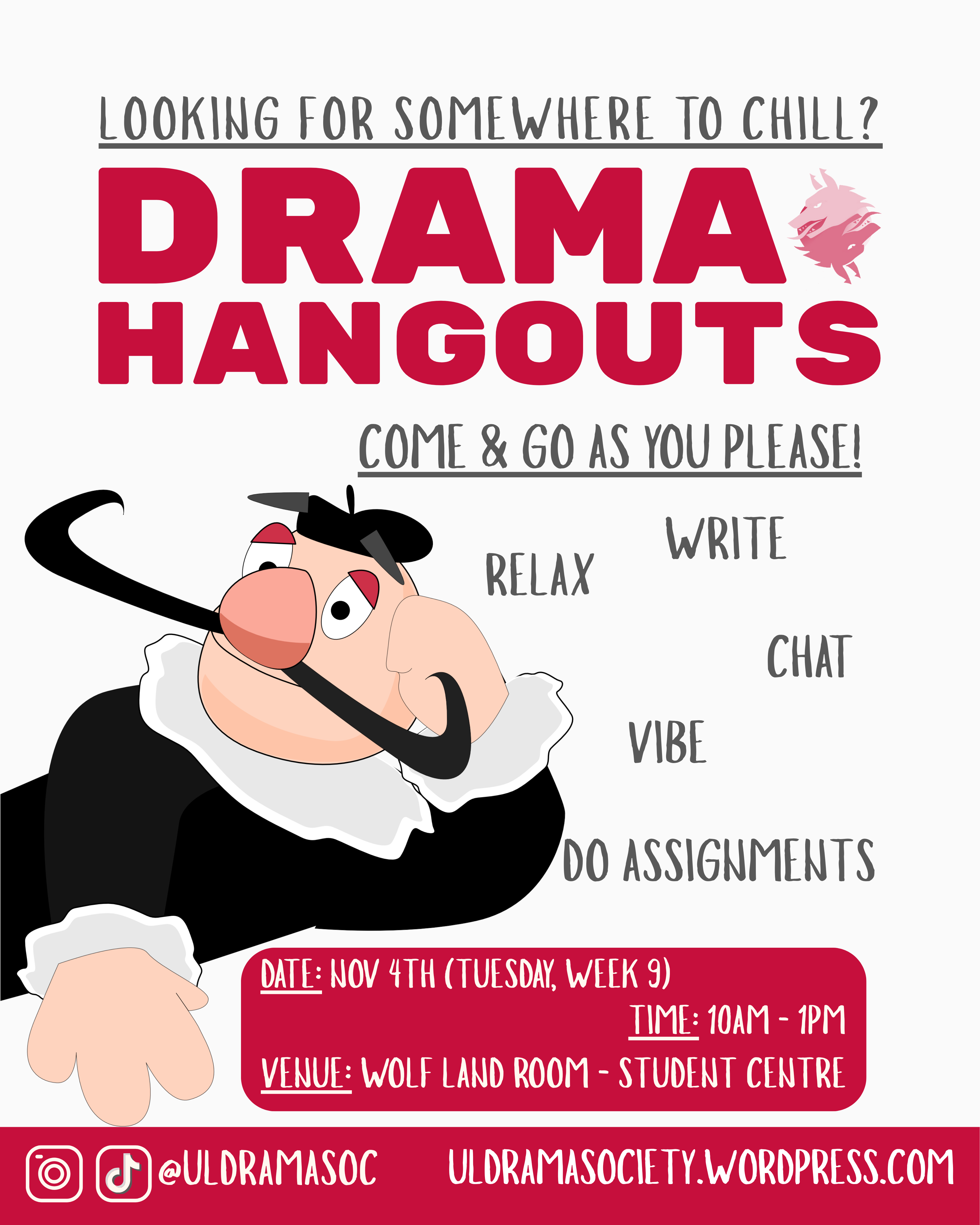 University is a busy place, and sometimes it can be hard to find a place to unwind. UL Drama Society is here to help with that. Join us Tuesdays in Wolf Land Room in the New Student Centre from 10am to 1pm!