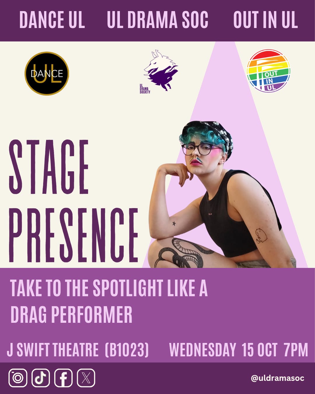 Kings, Queens and gender-neutral Monarchs, pack your heels and your most confident personae for this Stage Presence workshop! This week we are joined by Dance UL, Out in UL, and guest facilitator and Drag King, Asher B. Grant!