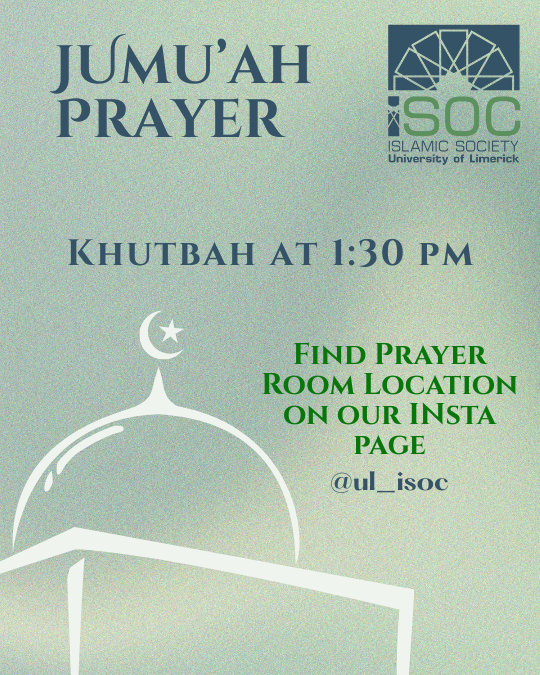 The University of Limerick Islamic Society (UL ISoc) invites you to join our Jummah (Friday) Prayer, held every Friday in the UL ISoc Prayer Room. This is a central moment in the week for the Muslim community to come together for worship, reflection, and connection.