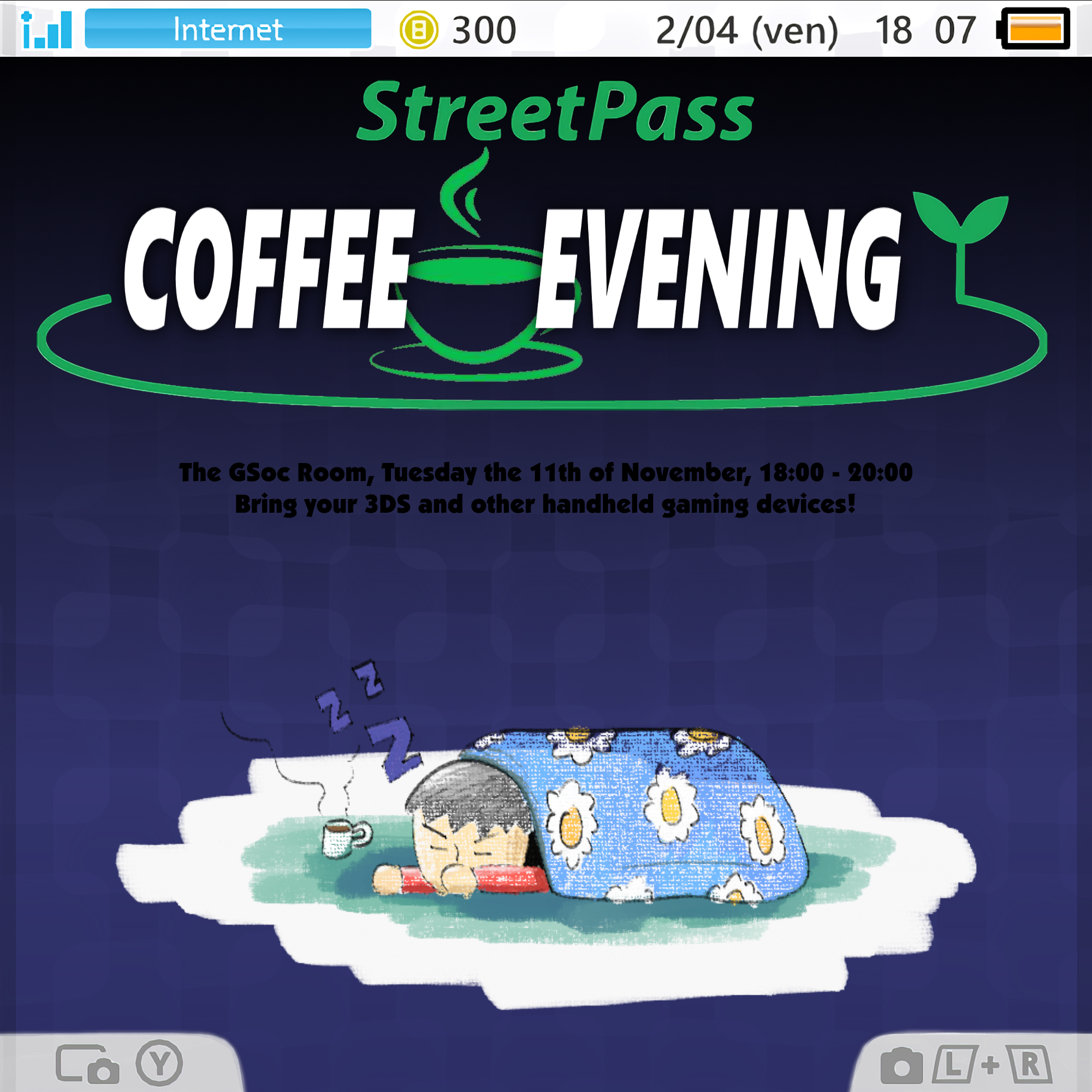 We heard you like your 3DS. We heard you like coffee. We also heard you apparently hate mornings. So we took your StreetPass Coffee Morning and put it in the evening instead.