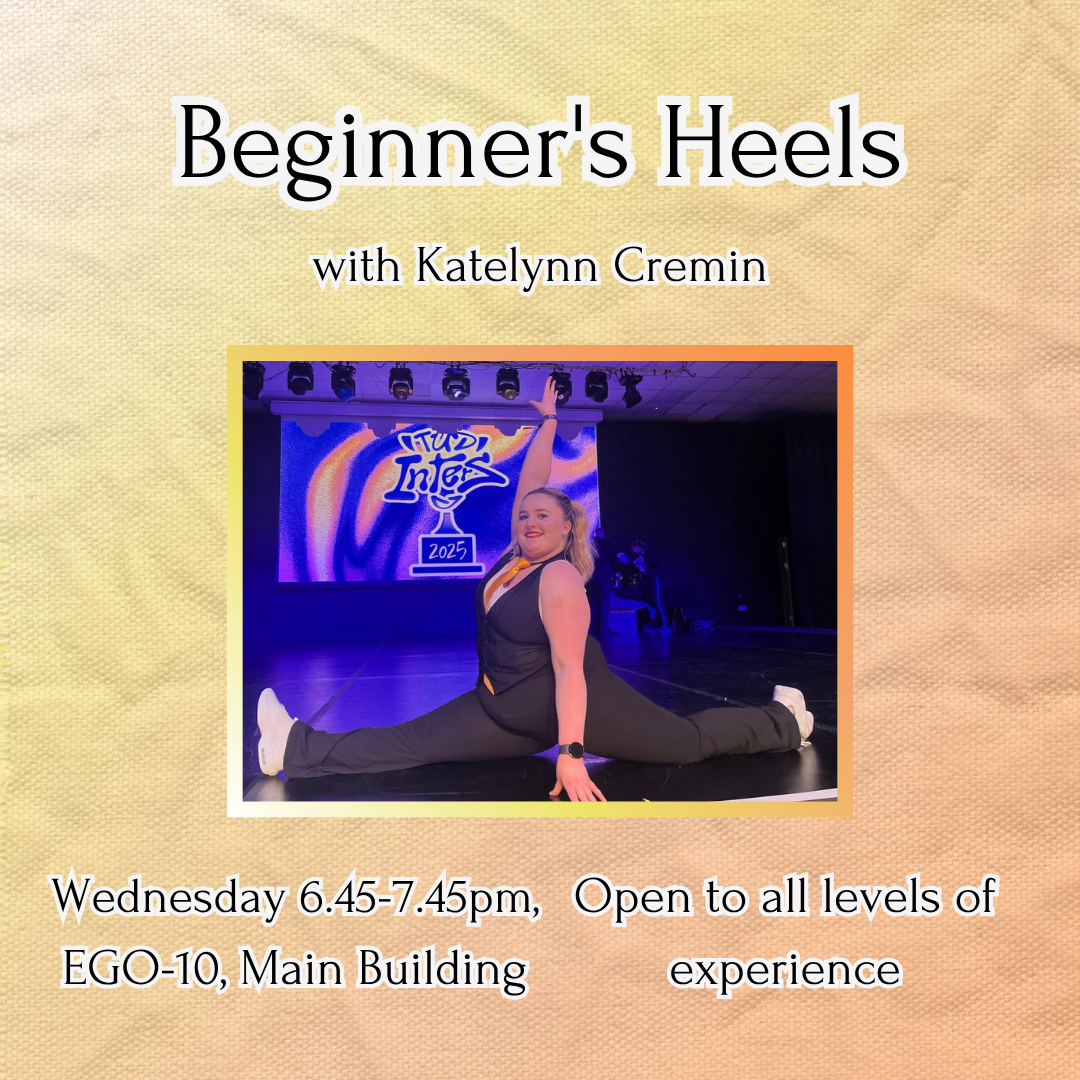 "Hi, I’m Katy! I’ve been dancing for over 10 years across like ballet, jazz, commercial, and hip-hop, and I’ve had the chance to perform on stages such as Cork Opera House and represent UL at Dance Intervarsities. I’m excited to be teaching heels again this semester and can’t wait to help you build confidence and performance in the style!"