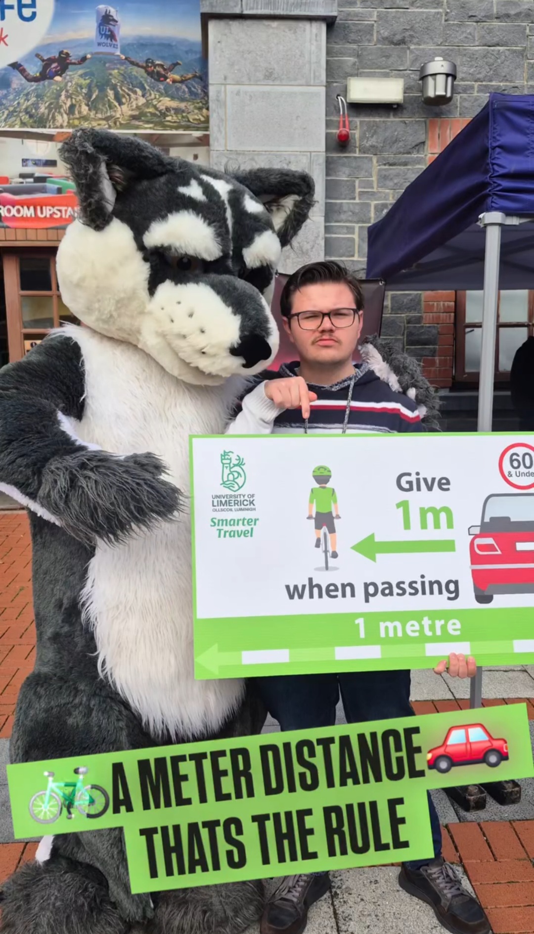 Last Tuesday we had a stall at the Farmers Market in the student courtyard where we promoted a new law which states that you give 1 meter when overtaking cyclists. We also played music by DJ Taha using a sound system powered by peddling a bike! Wolfie was so impressed he had to show up and check us out!