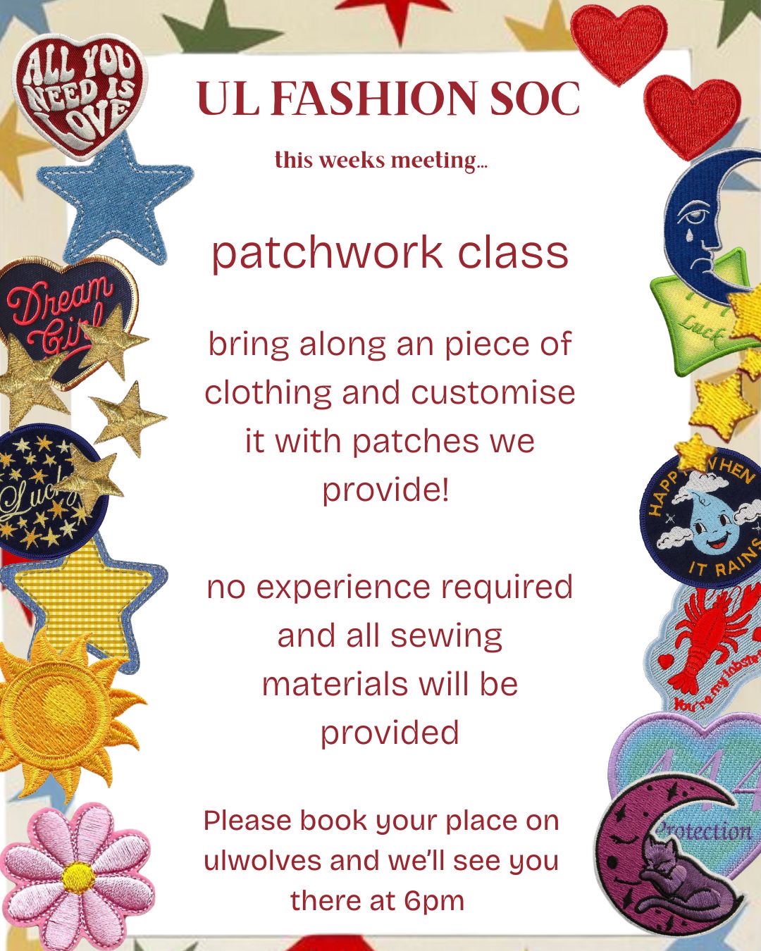 Join us this week on Tuesday evening to do some patchwork on clothes! Bring any clothes item and get patching! <3