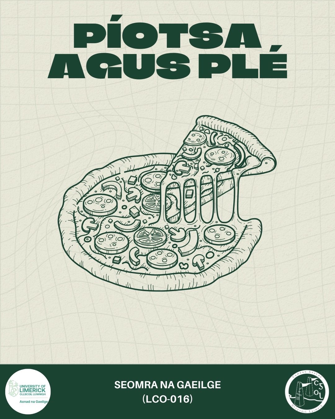 Deis le craic agus comhrá a bheith agat le Gaeil eile chomh maith le píotsa saor in aisce, urraithe ag Aonad na Gaeilge!