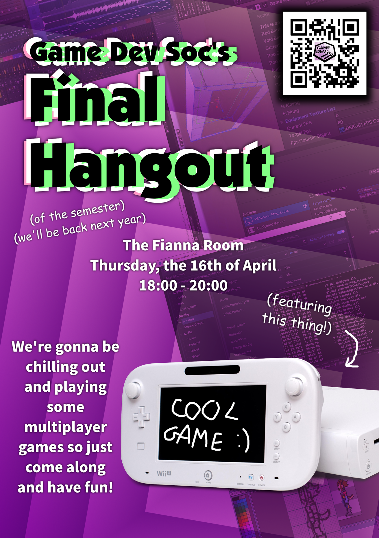 "Hello everyone!We are having our last events of the semester this week... (sniff) it's just... very hard to accept... the time went by so fast...Uh, anyway, we're having our usual Game Dev Hangout tomorrow in the Fianna Room from 12:00 to 15:00! This will also be the last one we do this semester.But if you aren't able to make it, maybe you'll be able to make it to our final event of the semester, which is: Another Hangout! how imaginative! We'll be playing multiplayer games on the absolute phenomenon that was the Nintendo Wii U. It's going to be just a chill session before we wrap up our events for the semester. It will be on in the Fianna Room, Thursday the 16th of April from 18:00 - 20:00.Make sure you can attend so you don't miss us too hard!"