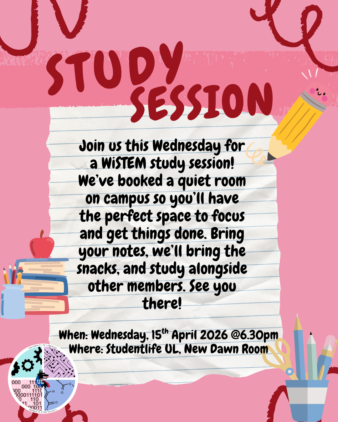 "Join us this Wednesday for a WISTEM study session! We’ve booked a quiet room on campus so you’ll have the perfect space to focus and get things done. Bring your notes, we’ll bring the snacks, and study alongside other members. See you there!"