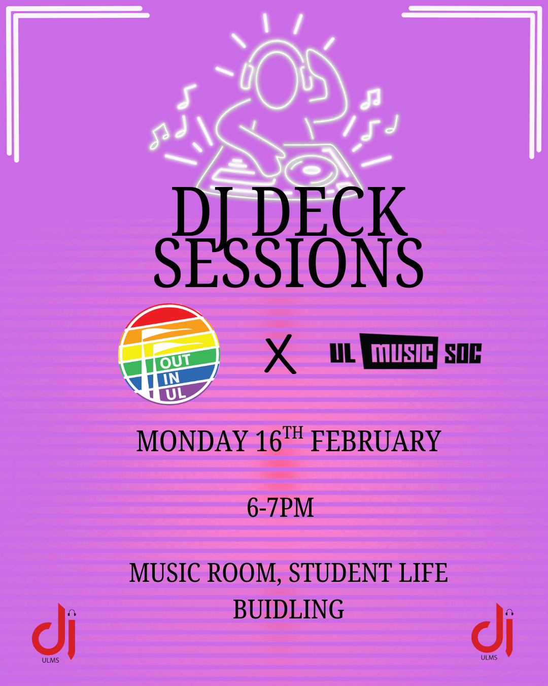 "Music societies DJs are collaborating with Out in UL to bring you an evening of good music and good vibes. Ever wonder what a DJ actually does?? if yes then join us in the music room on Monday night and learn how to DJ from our very own DJs from the music society.All members of music society and out in UL are welcome and no experience needed!!"