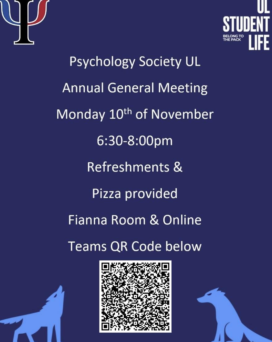 "This will be the first AGM of Psychology Society UL. We will make this a hybrid event, whereby users that want to join remotely will be given a hyperlink to do so.This AGM will have the goal of:Using the AGM as an event to get to welcome everyone to Psychology Society ULTo elect more members for our core committee, as well as elect our subcommitteeTo brainstorm ideas for formal and informal society events.We look forward to seeing you there."