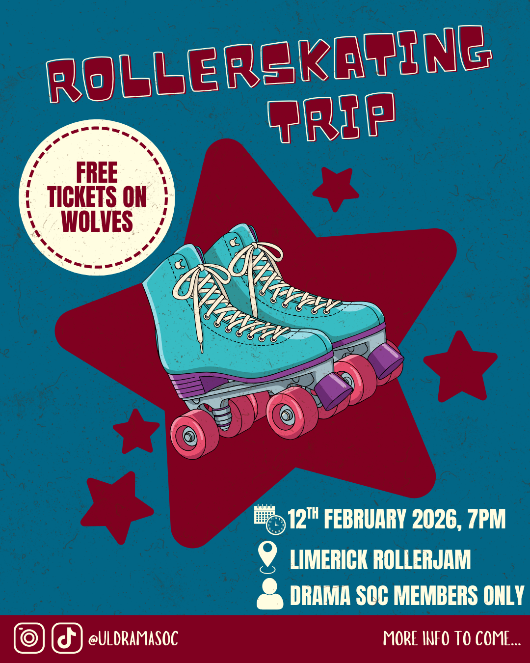 "Rollerskating Trip? Next Thursday (12th February), for our first event of the semester, we are heading to RollerJam Limerick for a rollerskating night! You can meet us at Stables Bus Stop at 6pm and get the bus with us, or meet us at RollerJam Limerick for 7pm Tickets are FREE but limited. Book on UL Wolves now to be one of the lucky 12! "