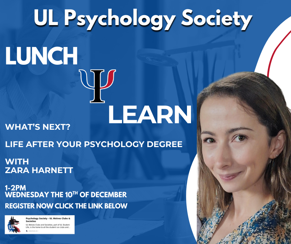 "Lunch & Learn: What's Next? Life after your psychology degree.We’re absolutely delighted to kick off our first-ever Virtual Lunch & Learn Series with the University of Limerick Psychological Society! This series is all about exploring life after your psychology degree, featuring real stories, unexpected turns, challenges, and the opportunities that open up once you step beyond the classroom.Each session, we’ll be joined by both past UL psychology students and other fantastic guests who all started exactly where you are now: with a passion for psychology. They’ve since gone on to take very different, and equally inspiring, career paths.Our speakers will share their educational journeys, the decisions that shaped their careers, and what their day-to-day work actually looks like now. Whether you’re curious, confused, excited, or all of the above, this series is here to give you real insight, real guidance, and a whole lot of inspiration.We can’t wait to learn, connect, and grow together. Let’s make this an amazing start to something special!We are delighted to welcome Zara Harnett to our first Lunch and Learn of our 2025-2026 series.Zara graduated from a BA in Psychology and Sociology in 2022 and the MSc in Psychological Science (Clinical Stream) in 2023 at the University of Limerick. During her time at UL, she partook in several voluntary research internships throughout her studies and worked on two different projects as a Research Assistant following the completion of her MSc. Her time at UL ignited a love for research within her.Zara began working as a Research Officer with the National Suicide Research Foundation in June 2024. Her role involves undertaking research on HSE National Office for Suicide Prevention funded projects relating to Service Evaluation. Zara also works as a voluntary Research Assistant for the Pregnancy Loss Research Group and published her first paper in 2025. Before beginning her role with the NSRF, she worked on a pilot programme involving the introduction of Assistant Psychologists into secondary schools across Limerick and Clare.In 2024, Zara was elected as a committee member onto the Psychological Society of Ireland’s Early Graduate Group and became co-chair of the group in 2025."
