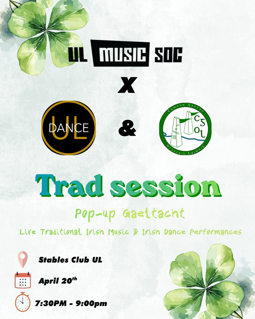 "This isn't our typical Trad Session. This is an exciting collab between UL Music Society, UL Dance and Cumann Gaelach in celebration of the Irish language and 2 of Irelands most popular and successful art forms, music and dance. Come down to the Stables Club on the 20th of April for some unreal craic agus ceol!!!"