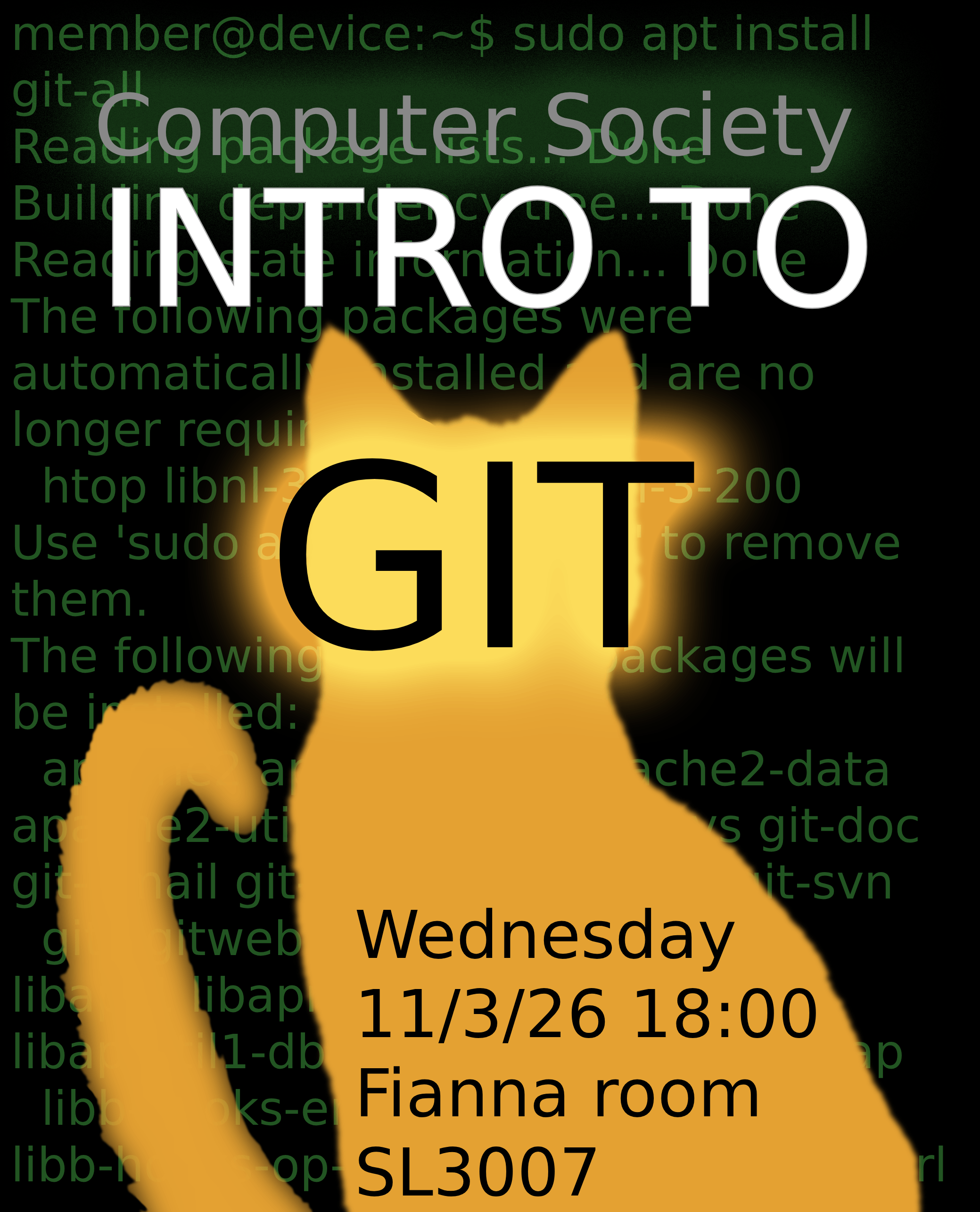 "Intro to GIT Version 2.0!!!!Our new and improved introduction to GIT, SSH, CI/CD, and pull requests is coming to YOU Wednesday 11/3/26 at 18:00 in the Fianna room (SL3007) so don't miss out! Tired of dysfunctional group projects? Want to rollback to previous versions of your project when you run yourself off on tangents or fixes that went nowhere? Already know Git but need to get your friends in on it? Computer society has your back! We'll be getting everyone from the ground up with absolutely NO assumed background knowledge this time in Git, Git LFS and CI/CD, Forgejo, repo creation and usage, SSH keys, troubleshooting and we'll even get you added to our very own skynet!"