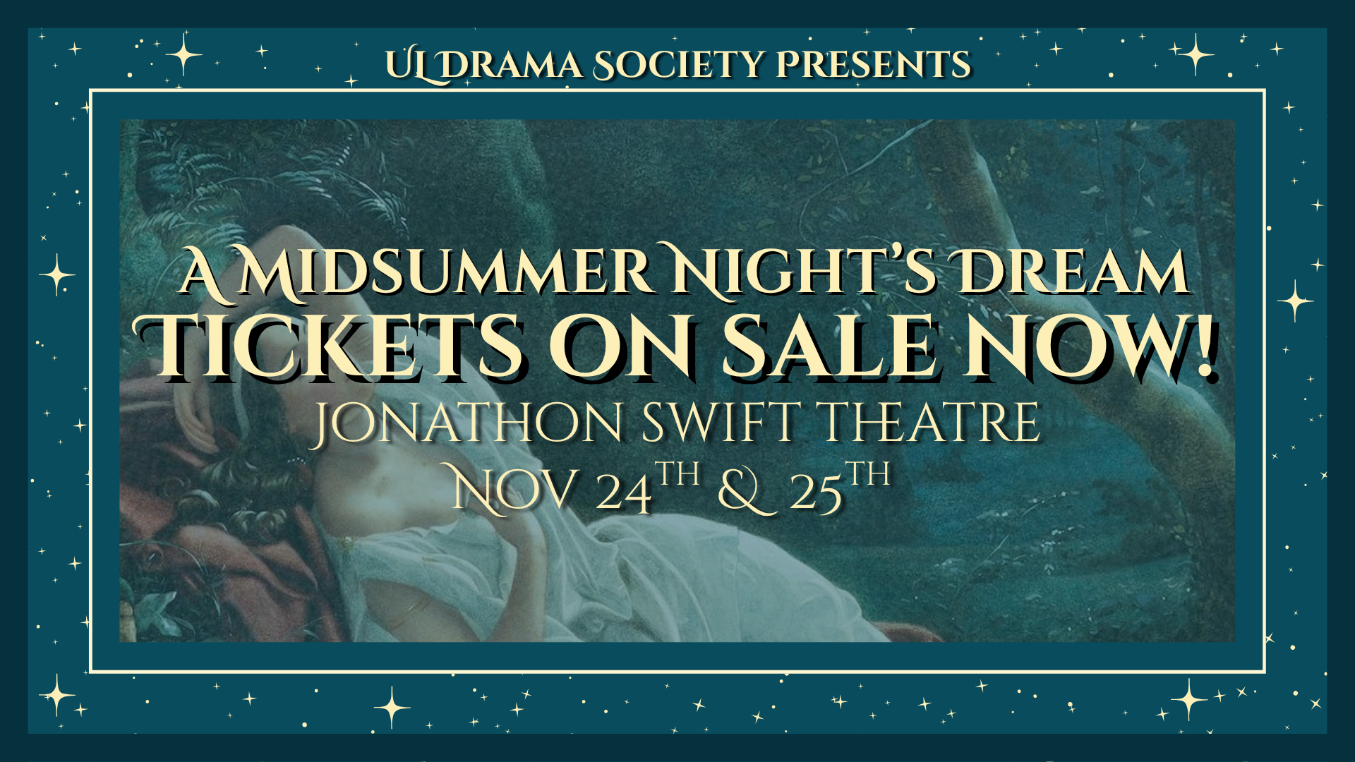 "Tickets for UL Drama Society’s production of ‘A Midsummer Night’s Dream’, taking place on November 24th and 25th, are on sale now! Tickets for both shows cost €7. Not only will you get to experience a magical night of mischief and chaos, your purchase will help support a student-run theatre society on its 50th anniversary! Can’t make it but still want to support the society? Purchasing a “Wish I Was There” for €5 lets you do that! Tickets are on sale up until the night of the show"