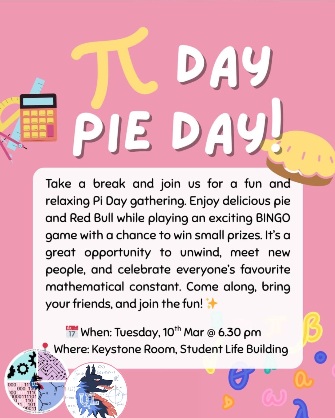 "Take a break and join us for a fun and relaxing Pi Day gathering. Enjoy delicious pie and Red Bull while playing an exciting BINGO game with a chance to win small prizes. It's a great opportunity to unwind, meet new people, and celebrate everyone's favourite mathematical constant. Come along, bring your friends, and join the fun!Remember, it’s on Tuesday, 10th of March at 6.30 in the Keystone Room, Student Life Building!"