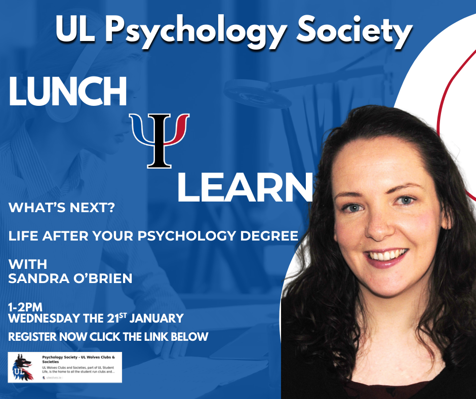 "Our next Lunch and Learn is a special one. When we asked students to give us one word about our next speaker, students said " legend", " present" "Sandra is what's the best thing about the course", and finally, how would you phrase someone that takes time to get to know everybody individually and remember them years later?We are so delighted and proud to have the wonderful Sandra O 'Brien as our next Lunch and Learn speakerSandra O’Brien is a Senior Technical Officer in the Department of Psychology at the University of Limerick. She completed her BA degree in Psychology from 2000-2003, followed by an MSc in Neuropharmacology from 2003-2005, both at the University of Galway (UoG). She took two years away from academia to work in a record shop before returning for two years, working as a Research and Teaching Assistant in Pharmacology at UoG, a Lecturer in Pharmacology in both TUS Athlone and UoG and a Technical Officer at UoG. She completed her PhD in Pharmacology, also at UoG, between 2009 and 2012. Spotting a pattern in her academic affiliations, she began her current role at UL in 2012. In her role as part of the Psychtech team, she is one of the contact points for technical expertise in the areas of Psychology research and teaching for 400 Undergraduates, 100 Masters students, 40 PhD students, 50 Clinical Psychology Trainees and 50 Staff.Lunch & Learn: What's Next? Life after your psychology degree.We’re absolutely delighted to kick off our first-ever Virtual Lunch & Learn Series with the University of Limerick Psychological Society! This series is all about exploring life after your psychology degree, featuring real stories, unexpected turns, challenges, and the opportunities that open up once you step beyond the classroom.Each session, we’ll be joined by both past UL psychology students and other fantastic guests who all started exactly where you are now: with a passion for psychology. They’ve since gone on to take very different, and equally inspiring, career paths.Our speakers will share their educational journeys, the decisions that shaped their careers, and what their day-to-day work actually looks like now. Whether you’re curious, confused, excited, or all of the above, this series is here to give you real insight, real guidance, and a whole lot of inspiration.We can’t wait to learn, connect, and grow together. Let’s make this an amazing start to something special!"