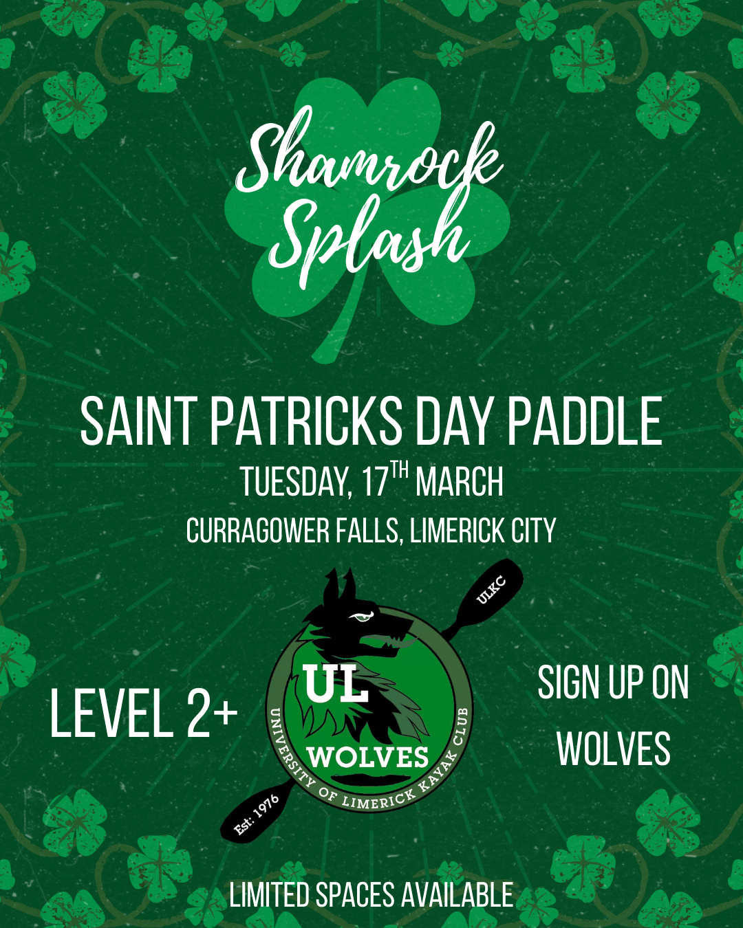 "St. Patrick's Day Paddle. We will be paddling around and on Gower Wave in Limerick City.Use this sign-up for level 2 paddlers who are new to whitewater kayakingA level 2 kayak skills cert is needed to sign up.We will meet at the UL Boathouse (https://goo.gl/maps/WuFLkHmh3r7XTCc38) at 9:00, then drive to the get-on point at Gower.Any kayaking gear, including wetsuits, can be provided; just have swimwear, thermals, old shoes, and a towel.If you have any questions, feel free to reach out."