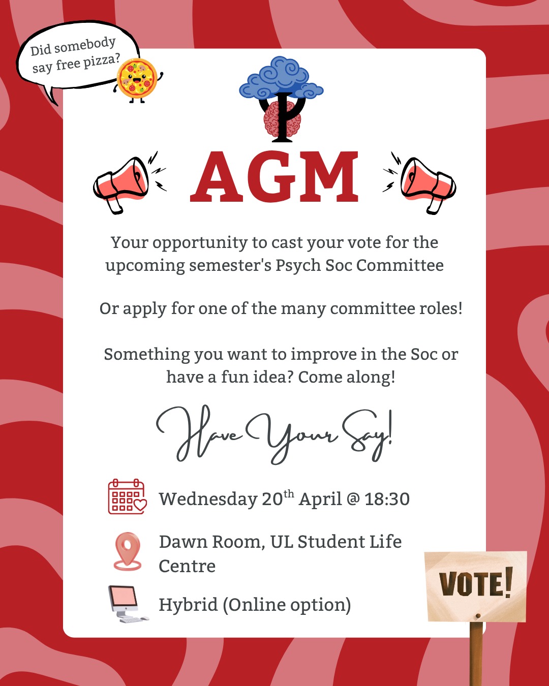 "AGM season is here! Want a say in what UL Psych Soc does next semester? Got ideas, energy, or just fancy getting more involved? This is your chance to vote, step forward for a role, and help shape the future of Psych Soc! We’re recruiting for many roles and we’d love to see new faces putting themselves forward! Wednesday 20th April @ 18:30 The New Dawn Room, UL Student Life Centre Hybrid option available Whether you want to run for a position or simply have your say, come along and be part of it!#ulpsychsoc #psychology #ulstudentlife #ulwolves #AGM #comealong"