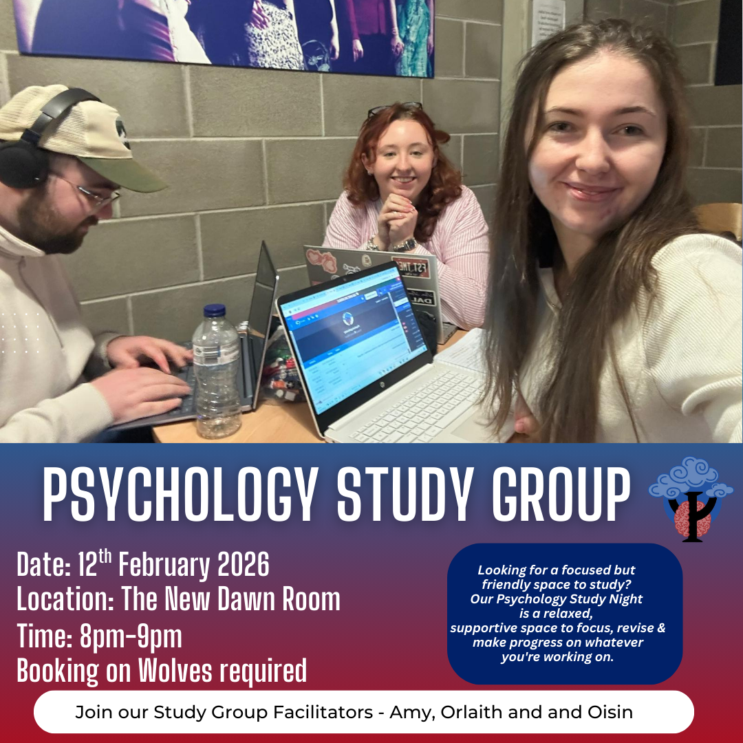 "Looking for a focused but friendly space to study? Our psychology Study Night is a relaxed, supportive space to focus, revise & make progress on whatever you're working on.Whether you're doing up lecture notes, starting assignments, revising material for exams, or meeting up for group work, this will be a chill, low-pressure environment to get together with other students and study for the evening.Open to all years and courses. So come along, settle in & get some solid work done :)(Booking is required on UL Wolves)"