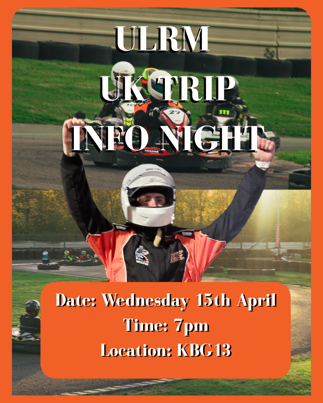 "Following on from our announcement at the AGM about our second UK trip we are going to have an info night on Wednesday 15th April at 7.00pm! This is a great time to find out all the details about the trip and to ask any questions you may have. Attendance at this info night is mandatory if you would like to go on the trip :) Alongside the info night we will be releasing a sign up form for the trip after the info night on Wednesday! We will have more information about the application form and timeline at the info night. Applications will be due Friday April 24th. Once all the applications are in we will let people know if they got a place on the trip in the coming weeks.The meeting will be taking place in KBG13 in the Kemmy Business School building. We look forward to seeing you there!"