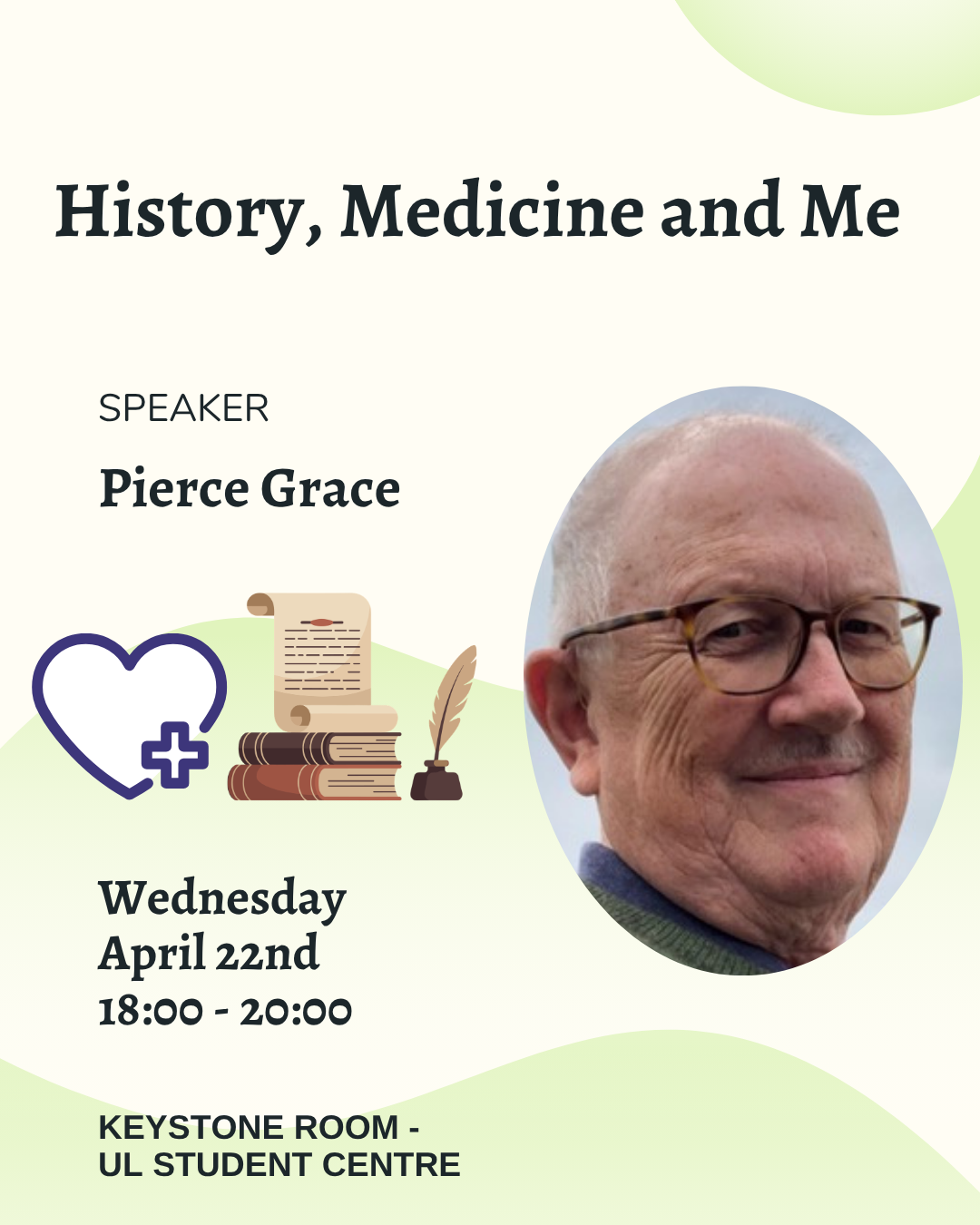 "Pierce Grace - History, Medicine and MeJoin us Wednesday the 22nd at 6pm (immediately after our AGM) in the Keystone Room for our final event of the Semester where we will be hearing from UL Associate Professor Pierce Grace.Pierce Grace is from Kilkenny and was educated locally at St Kieran’s College. He qualified in medicine from the RCSI in 1976 and thereafter pursued a career in surgery, training in Ireland, Britain and the United States. He was appointed as a Consultant Surgeon in Limerick in 1996. Pierce is an Adjunct Professor of Surgery and taught surgery and anatomy at the UL School of Medicine until 2020.Pierce has had a life-long fascination with history, especially the history of medicine in Ireland. In 2013 he was awarded an MA in Local History from UL and has history publications in Irish Historical Studies, History Ireland, Administration, the Proceedings of the Royal Irish Academy, Peritia and Archivium Hibernicum. He is an Associate Fellow of the UL School of History & Geography and frequently contributes historical articles to the Irish Medical Times. His talk to the UL History Society, ‘History, Medicine and Me’ will focus on his long interaction with history and its study."