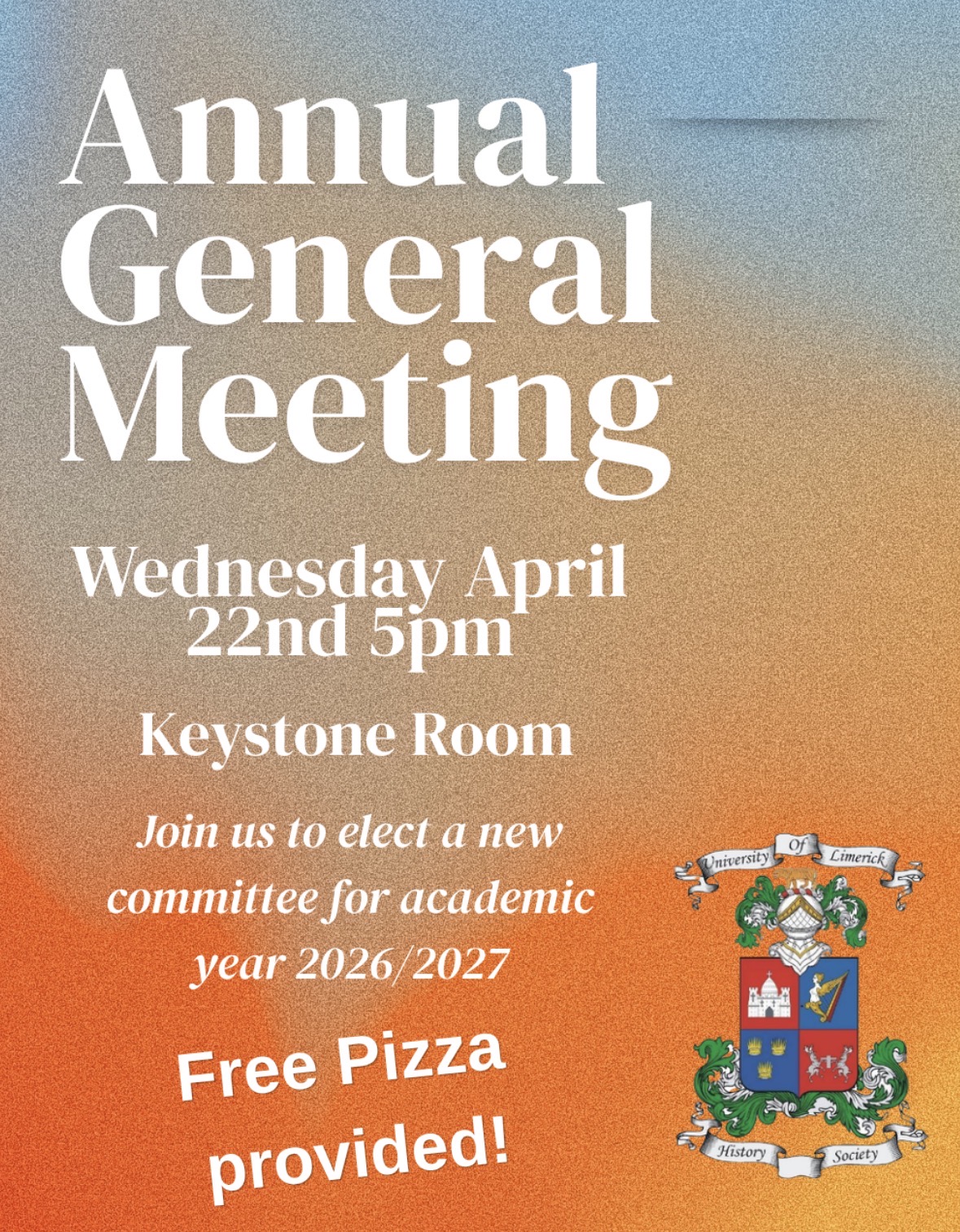 "Annual General MeetingJoin us at 5pm on Wednesday the 22nd of April in the Keystone Room of the Student Centre to elect a new committee for the coming Academic Year of 2026 / 2027.A good committee is vital to a successful society, so we strongly encourage you all to attend so you can have your voice heard and run for election should you wish to. Free Pizza Provided!Event to be followed by talk from University of Limerick Associate Professor Pierce GraceHope to see you all there!"