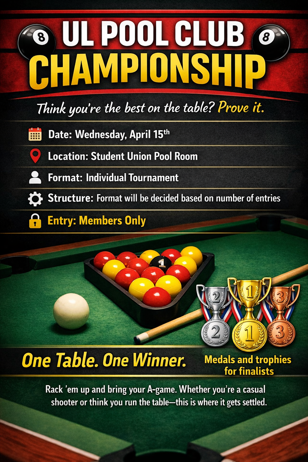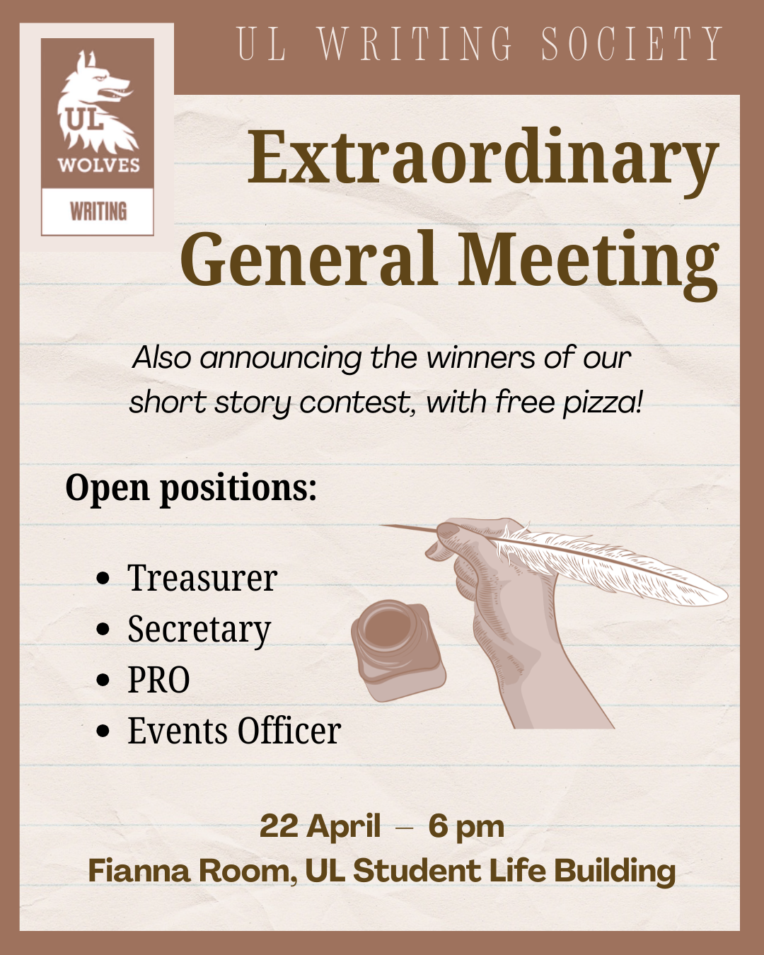 "Annual General MeetingJoin us at 5pm on Wednesday the 22nd of April in the [TBD] Room of the Student Centre to elect a new committee for the coming Academic Year of 2026 / 2027.A good committee which reflects the membership is vital to a successful society, so we strongly encourage you all to attend so you can have your voice heard and run for election should you wish to.(Event to be followed by talk from University of Limerick Associate Professor Pierce Grace)"