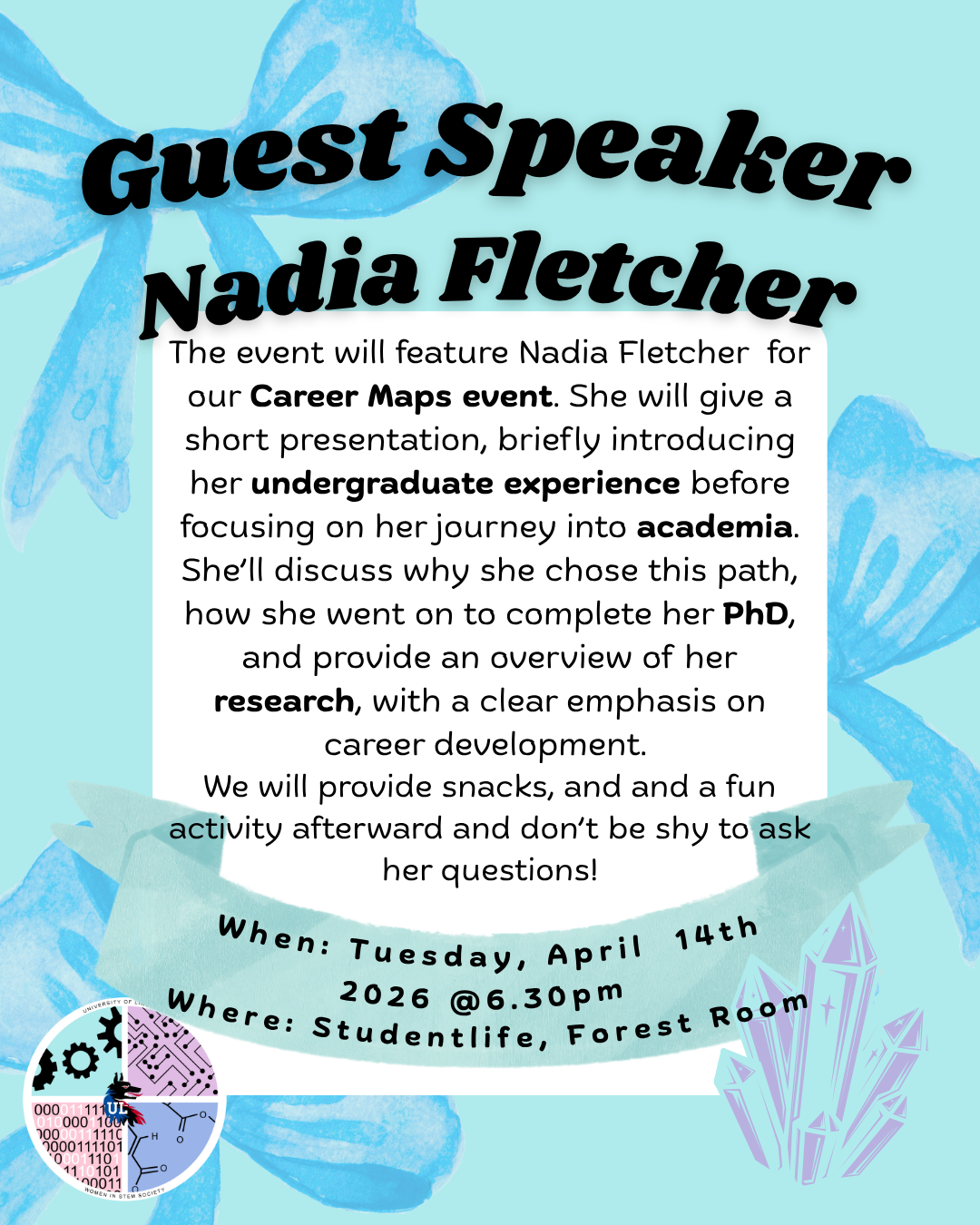 "The event will feature Nadia Fletcher for our Career Maps event. She will give a short presentation, briefly introducing her undergraduate experience before focusing on her journey into academia. She’ll discuss why she chose this path, how she went on to complete her PhD, and provide an overview of her research, with a clear emphasis on career development.We will provide snacks, and activity afterward and don’t be shy to ask her questions!"
