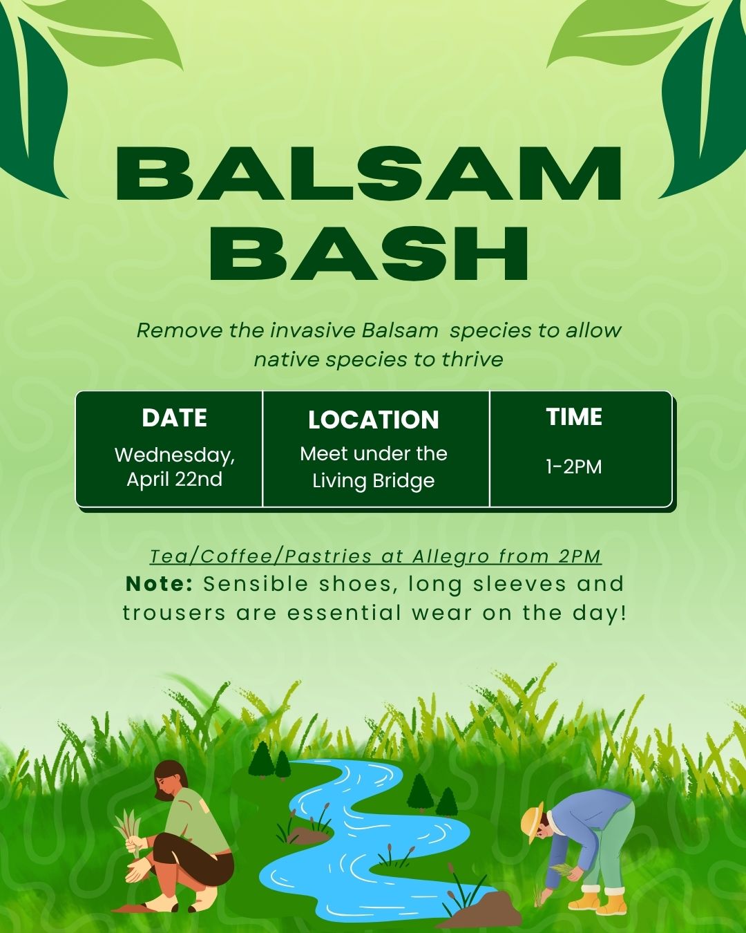 "Balsam is an invasive species that grows along the river on campus around this time of year so we are just going to give an hour to try remove as much of it as we can! We recommend you wear sensible shoes, long sleeves and trousers on the day! There'll be pastries in Allegro at 2pm. We will be working alongside the UL Environmental Committee on the day as well! "