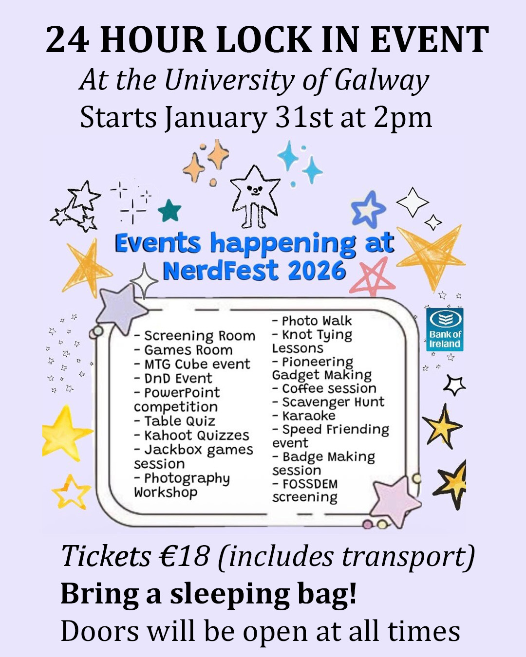 "Join us for Nerd Fest Lock In at the University of Galway with TU Dublin and University of Galway! The Lock In takes place from 2pm on Saturday 31st January to 2pm Sunday 1st February! There will be a bus going from UL that is included in this ticket price. Bring a sleeping bag as this will be overnight! Food will be provided by UG but feel free to bring snacks. "